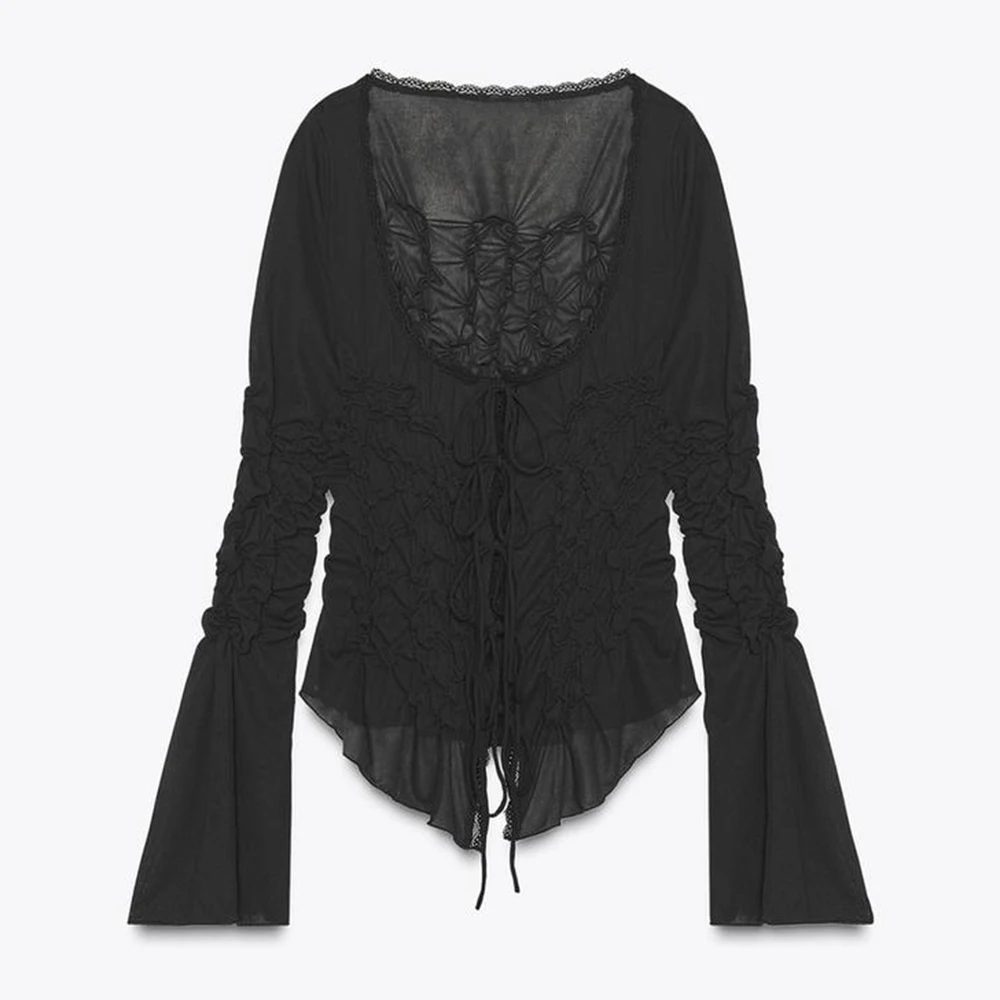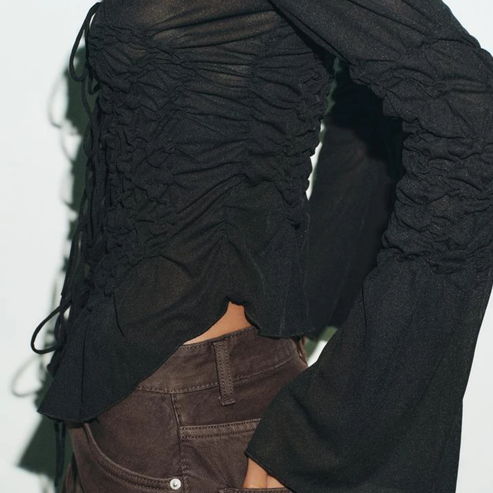 Wisrise Fashion Factory New Design Sexy Elegant Style Women's Black Ruched U Neck Slim Fit Long Sleeve Blouses